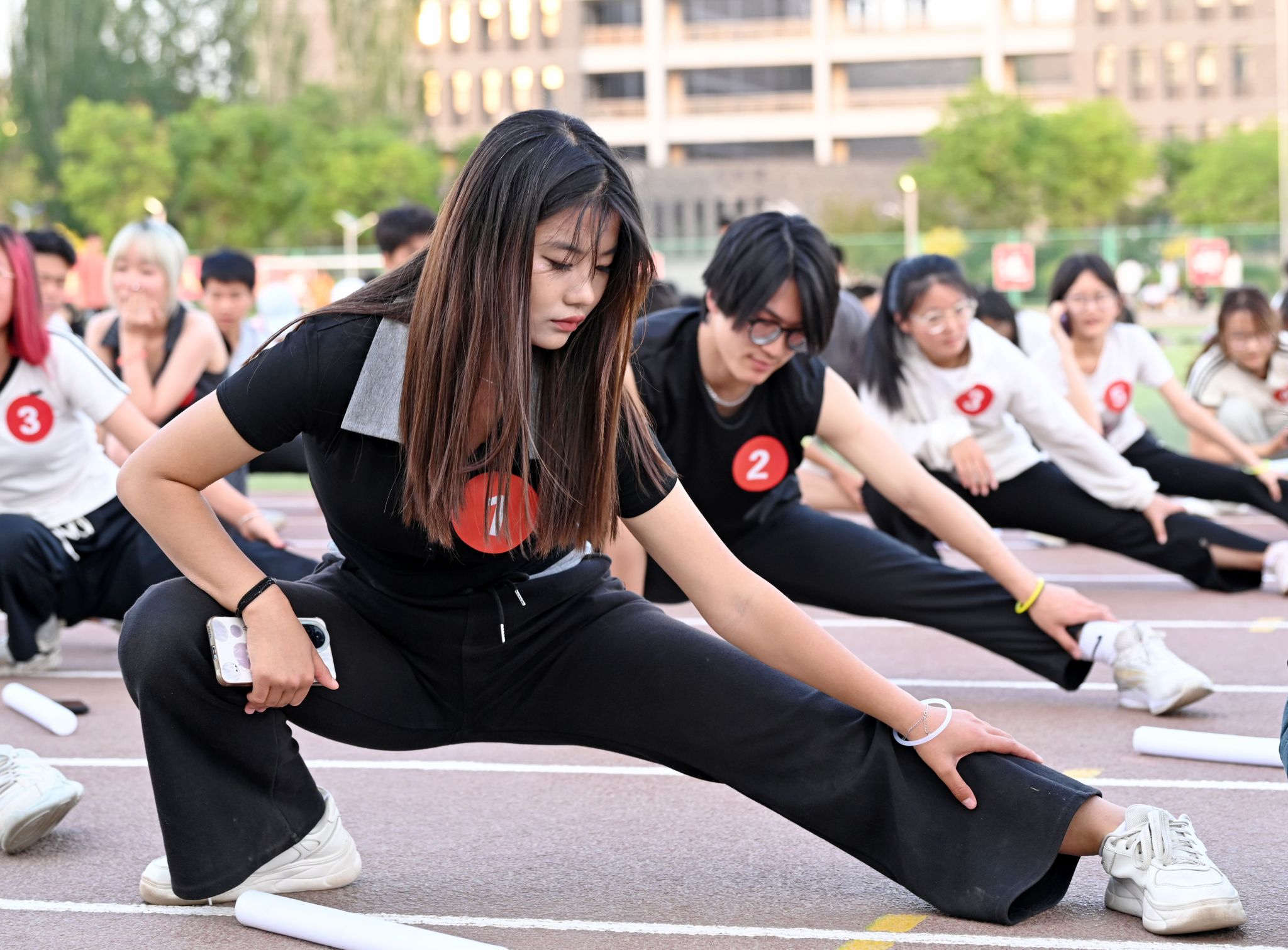 夜跑活动开始前,同学们身着运动衫,佩戴荧光手环、手拿荧光棒,化身“追光少年”,热身结束后,在出发点有序列队集结。